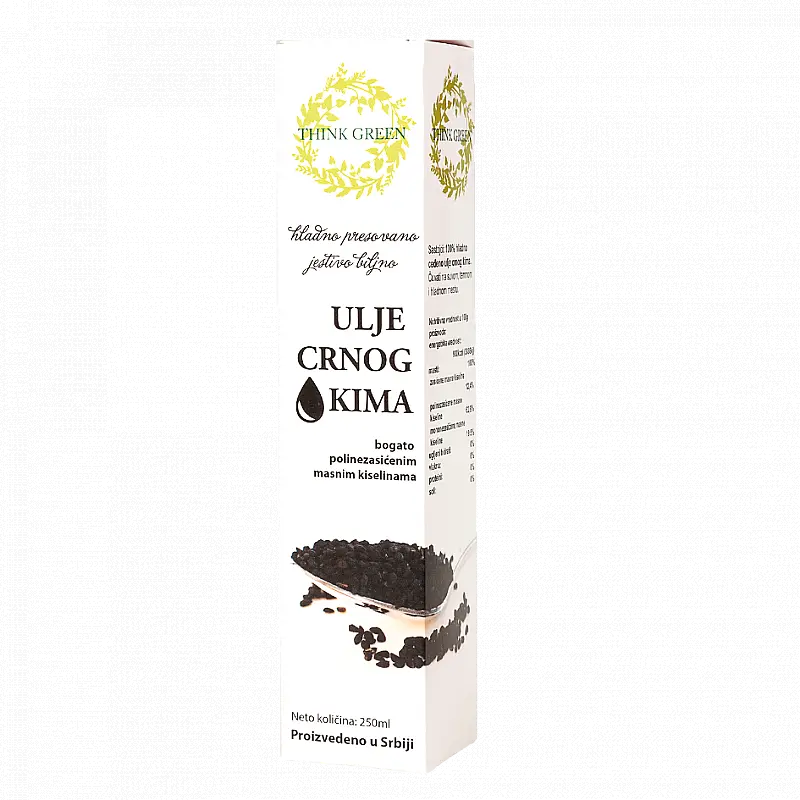Ulje crnog kima se dobija hladnim presovanjem semenki crnog kima. Bogato je esencijalnim masnim kiselinam, antioksidansima, vitaminima i mineralima. Ima visoku nutritivnu vrednost.Prirodan proizvod bez gluten i veštačkih dodataka.Ulje crnog kima nije predviđeno za prženje i pečenje. Koristi se za sve vrste salata i jela od povrća , naročito pirinča i sočiva. Unošenjem male količine ovog ulja u ishranu može značajno uticati na poboljšanje vaše zdravlje.